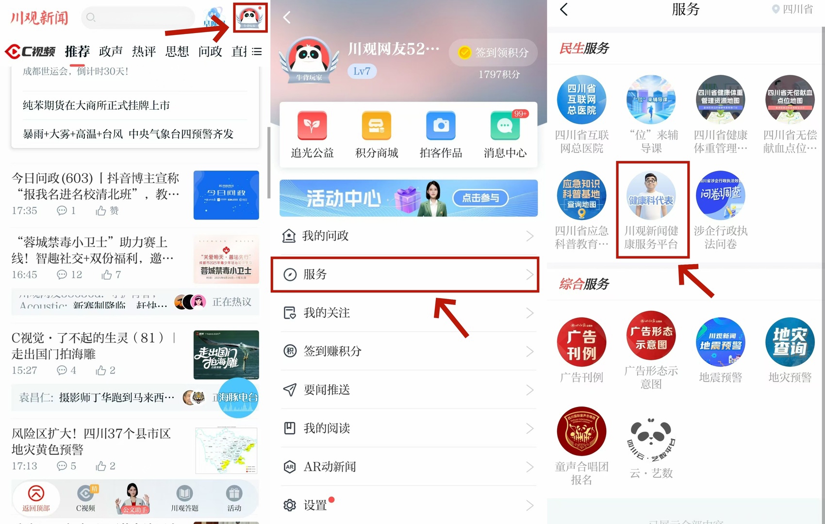第二步:点击首页右上角【我的】-【服务】,找到服务入口,点击进入川观新闻健康服务平台——“健康科代表”。