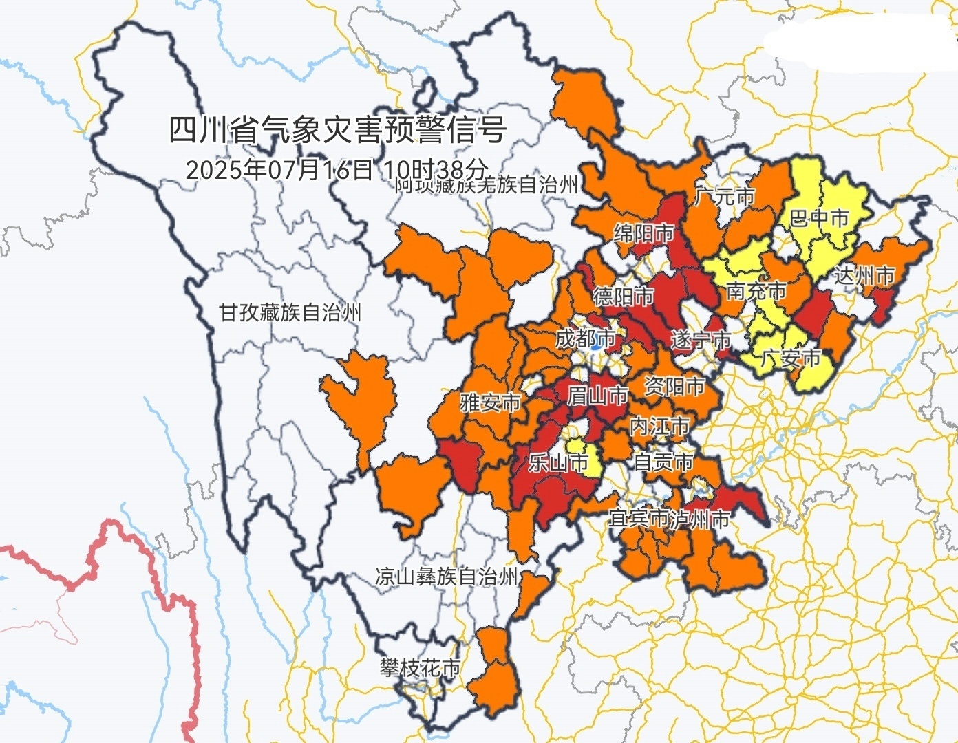 7月16日10时38分四川省高温预警信号分布图。