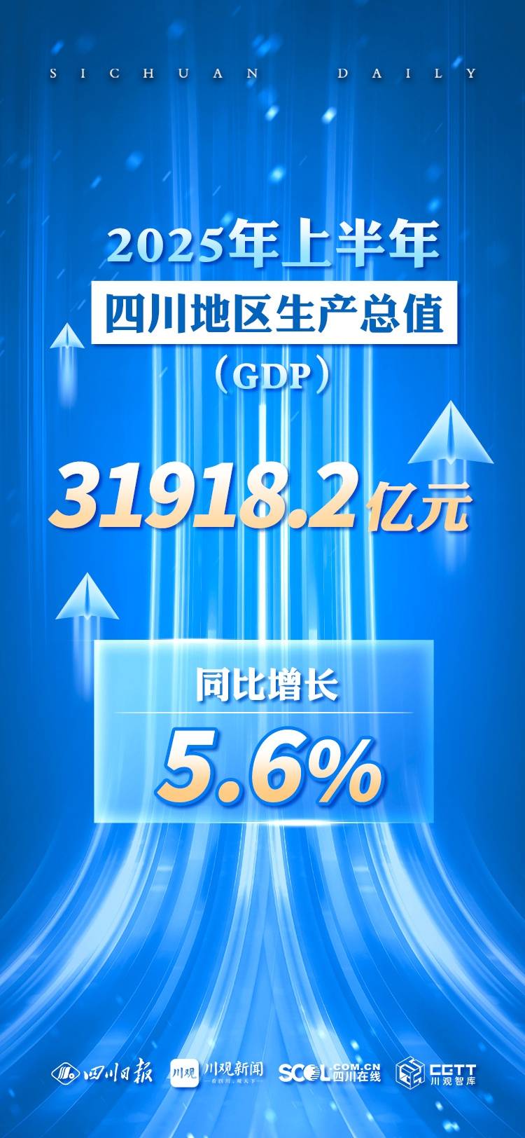 7月17日,记者从省政府新闻办召开的2025年上半年四川经济形势新闻发布会上获悉,根据地区生产总值统一核算结果,2025年上半年四川地区生产总值(GDP)为31918.2亿元,按不变价格计算,同比增长5.6%。