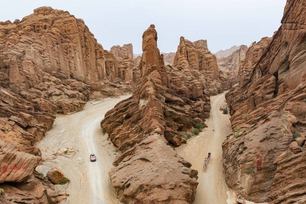 7月17日,人们驾车、骑骆驼在独库公路附近的克孜利亚大峡谷游玩(无人机照片)。