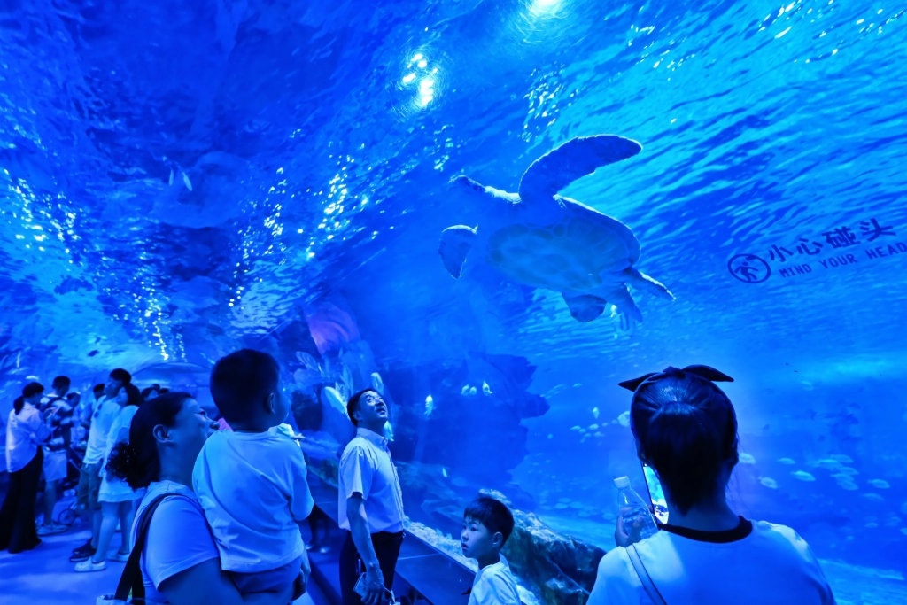 7月17日,家长带着孩子在天津市滨海新区极地海洋度假区参观游览。