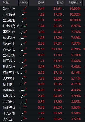 当天,川股借势发力,多只个股在相关板块行情中占据重要位置。稀土与锂矿产业链上,盛和资源大涨7.85%,盛新锂能强势涨停,成为板块核心标的;电力股中,乐山电力大涨4.12%,西昌电力涨3.58%,明星电力小幅上扬;创新药领域,川股欧林生物以18.76%的涨幅领跑板块。