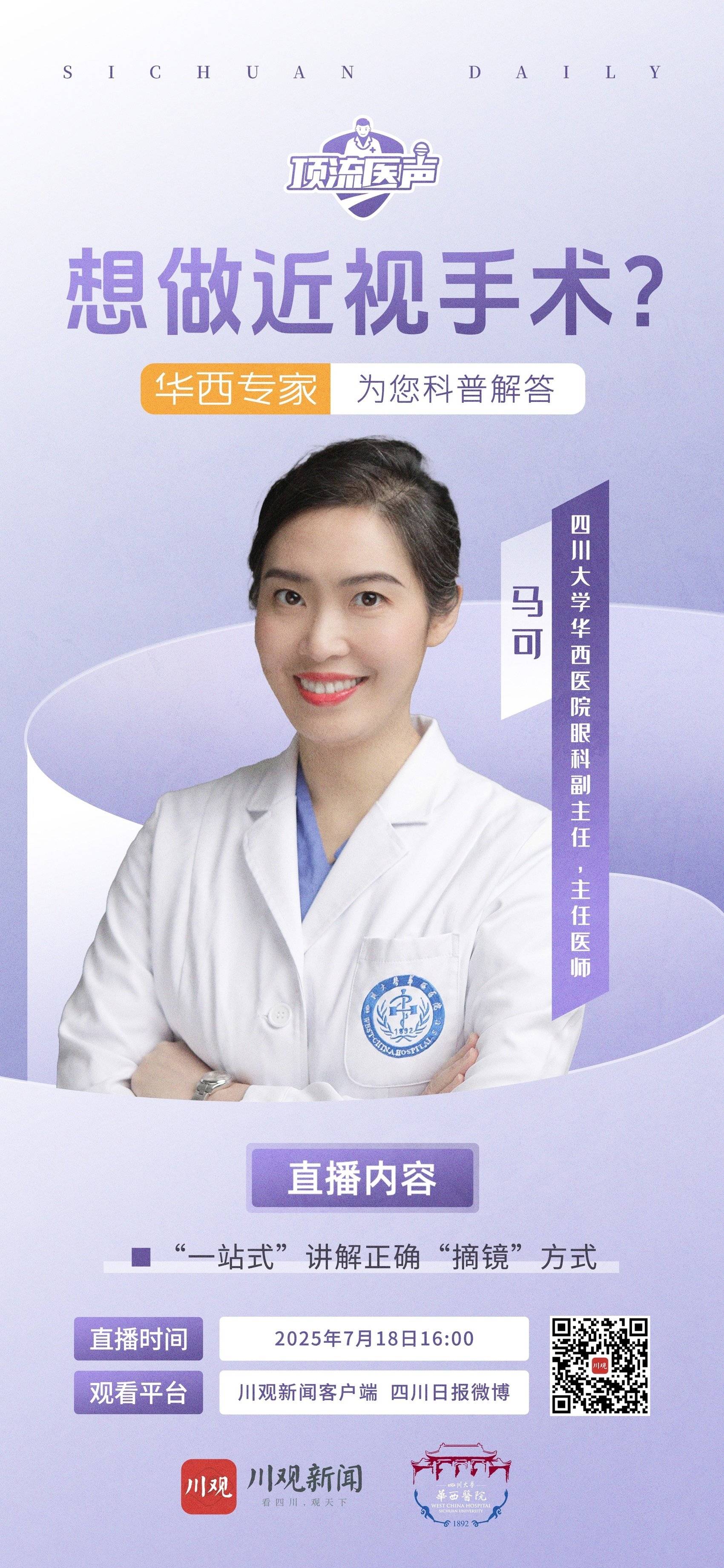 暑假来了, 对青少年来说,不良用眼习惯易引发近视等问题,各类眼部疾病进入高发阶段。高考后的暑假也是近视手术高峰期。如何在暑期科学护眼?如何做好近视防控?7月18日,川观新闻特邀四川大学华西医院眼科副主任、主任医师马可教授做客“顶流医声”直播间,就暑期青少年护眼、近视防控、常见眼部疾病防治等相关问题进行解答。