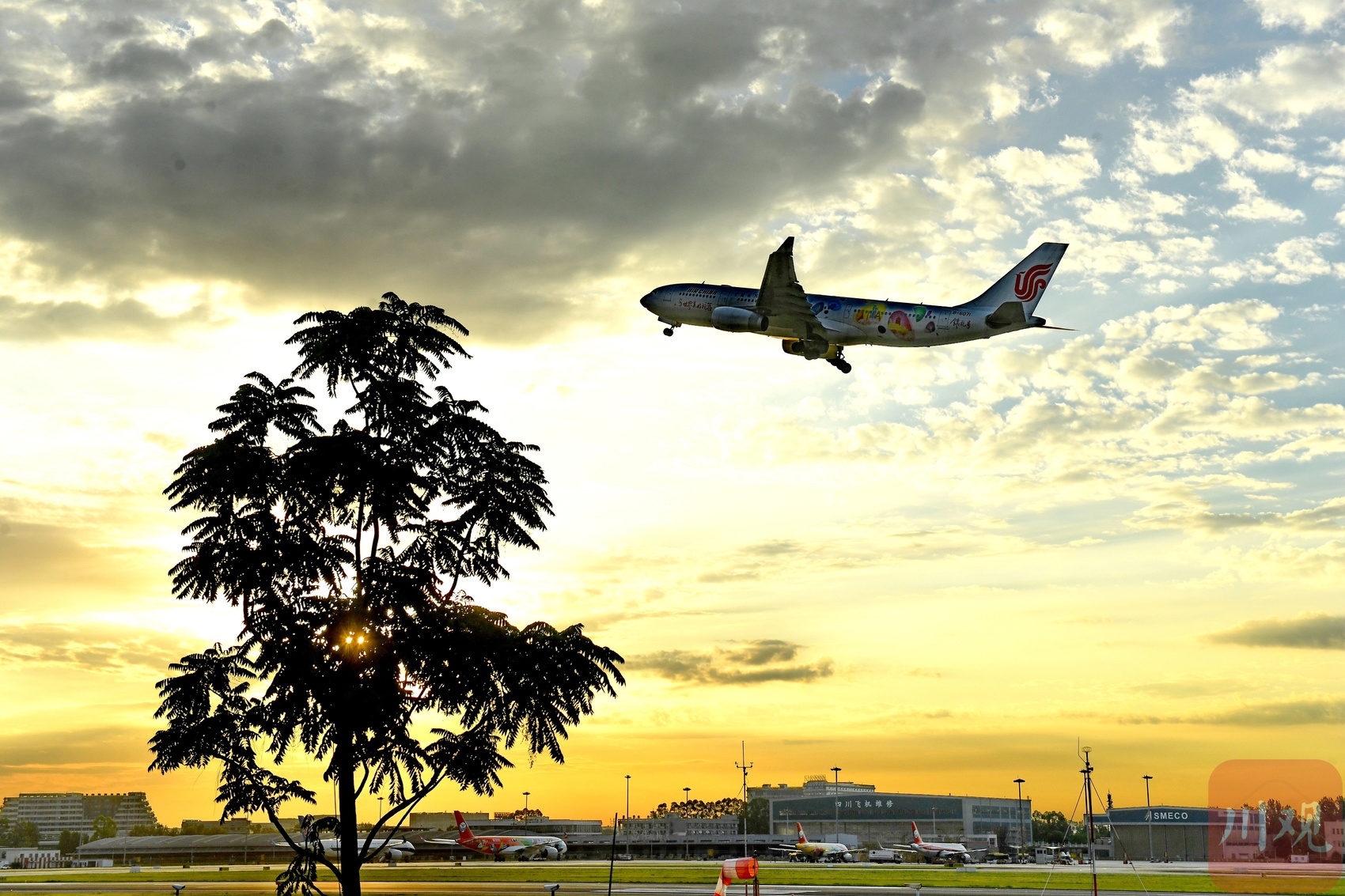 7月21日清晨6时许,朝阳映照着成都双流国际机场,在蓝天与朝霞的映衬下,起飞的航班勾勒出机场旁的晨光之美。