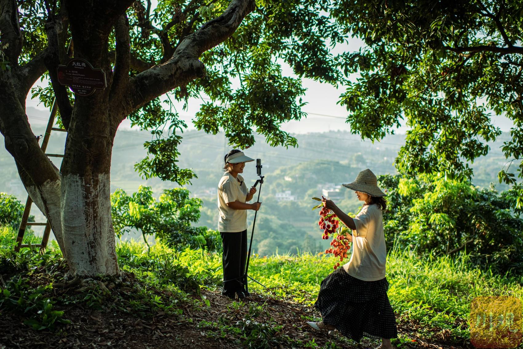 7月16日清晨,合江县荔江镇荔枝古树公园内,新农人姜晓霞(右)带着团队直播带货。