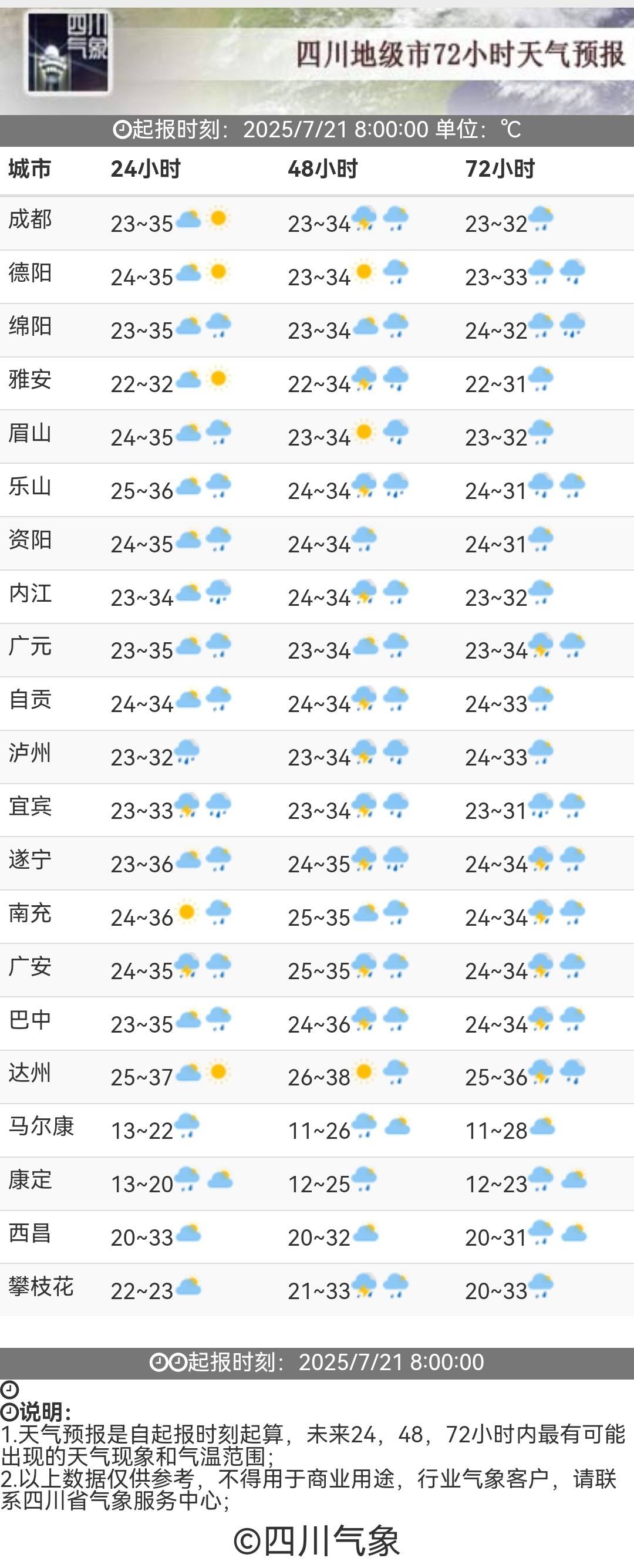 23—27日:我省大部地方有阵雨或雷雨,其中盆地大部有中雨,局部大雨到暴雨;攀西地区大部有中雨,局部大雨。
