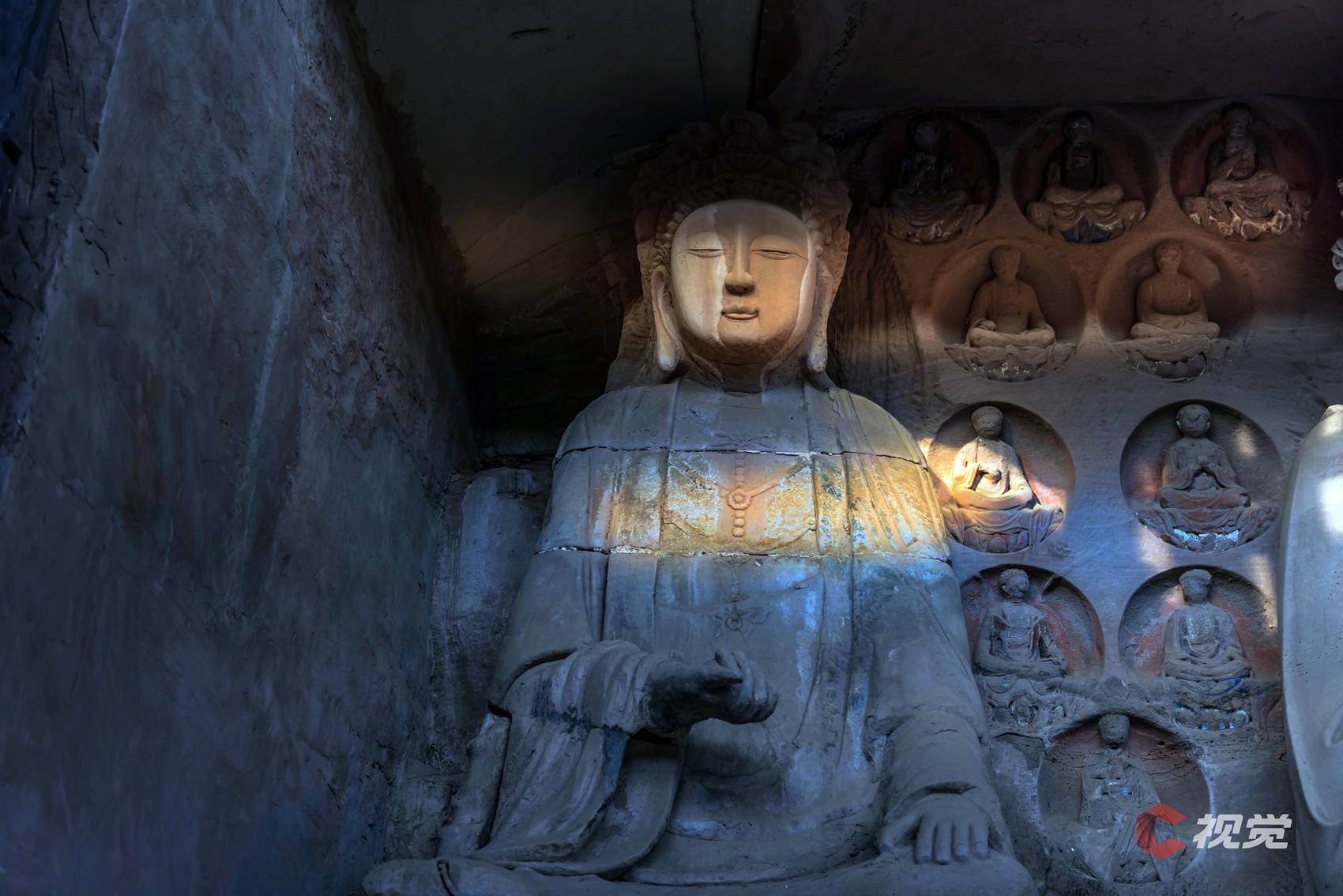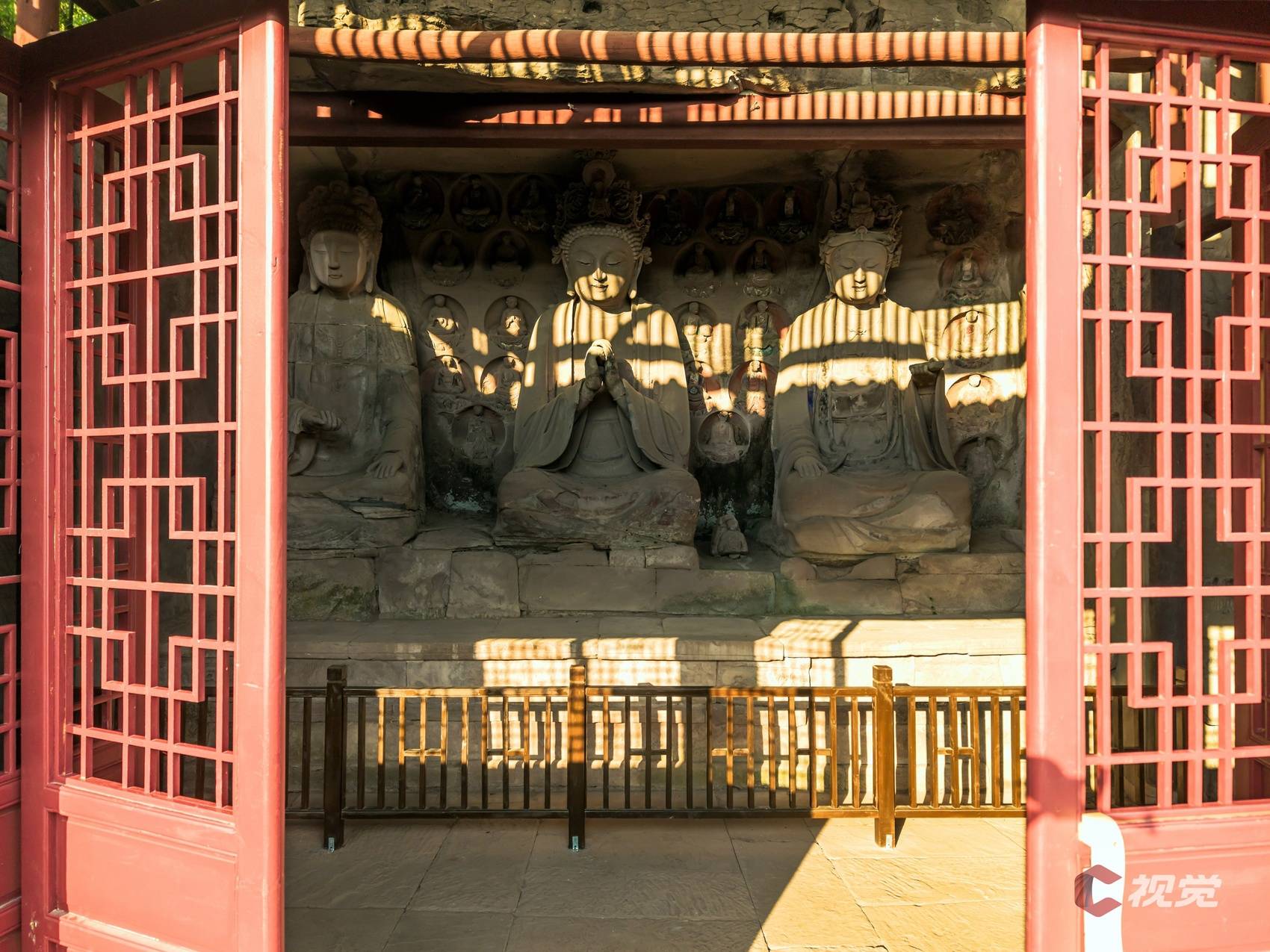 7月21日傍晚,资阳市安岳县林凤镇塔坡石刻造像风景区内,入伏晚霞透过窗户照射到千年佛像身上。