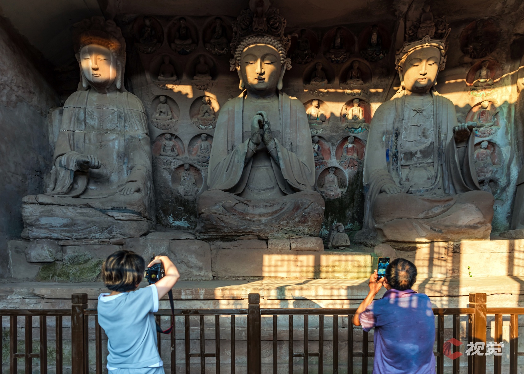 7月21日傍晚,资阳市安岳县林凤镇塔坡石刻造像风景区内,游客冒着高温拍照打卡。