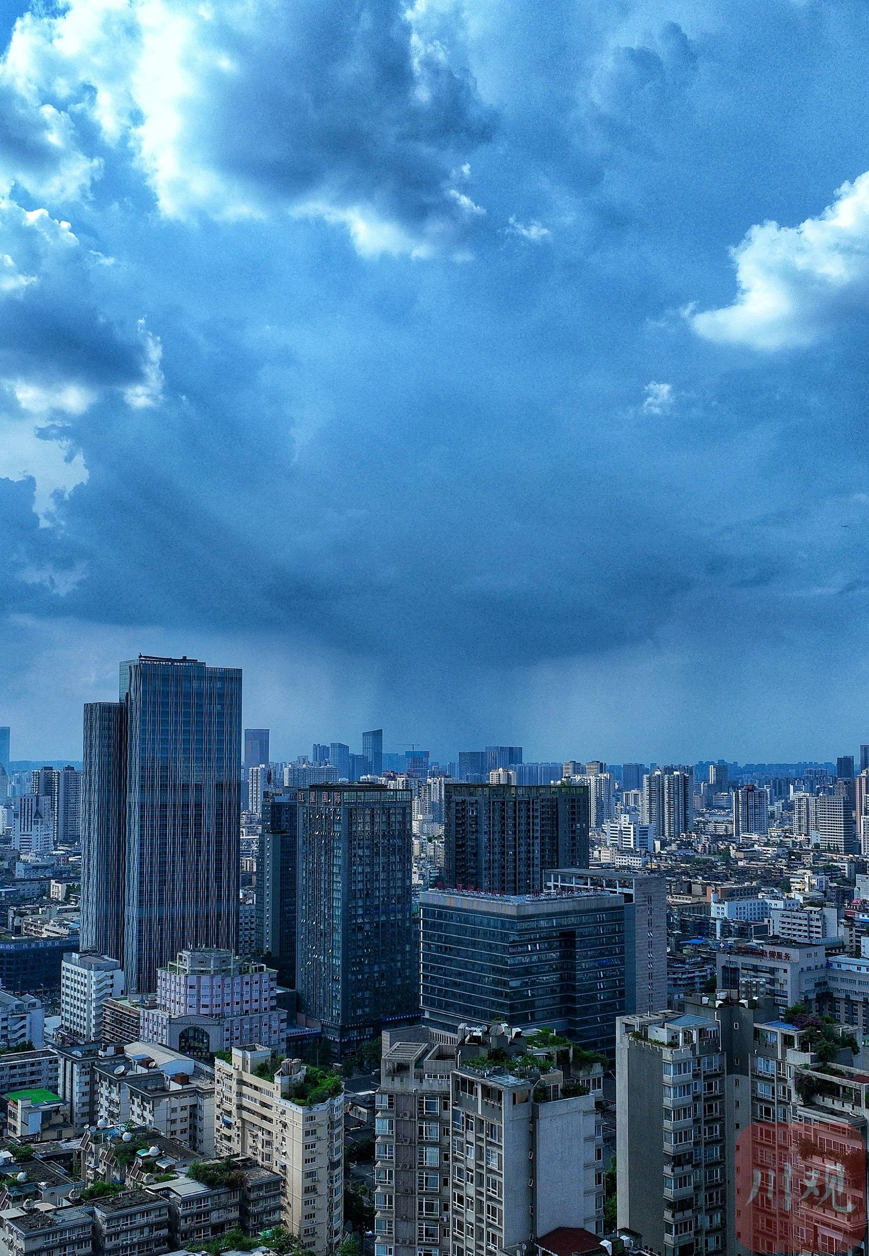 7月22日大暑,成都热浪翻滚。17时许,一场罕见的“半边太阳半边雨”在城市上空上演:城北,厚重积云似灰色幕布低垂,雨丝淅沥;城南,阳光仍穿透云层,耀得楼宇明暗分明。雨带正随云幕缓缓南移,暑中送凉。出门带伞,成了成都人应对瞬息天气的默契。