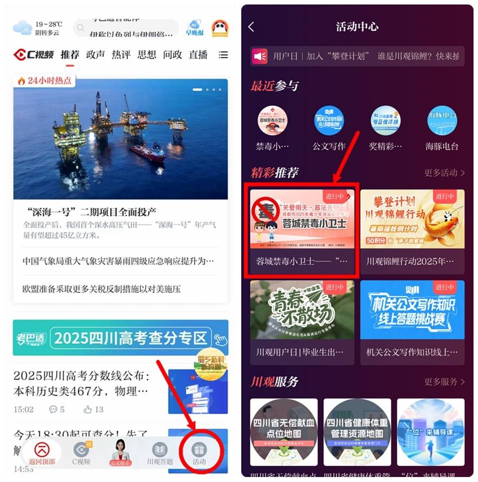 方式三:在川观新闻首页,点击“活动”,找到《蓉城禁毒小卫士——“关爱明天·普法先行”成都市2025年青少年法治知识学习》活动图片,点击即可参与答题;