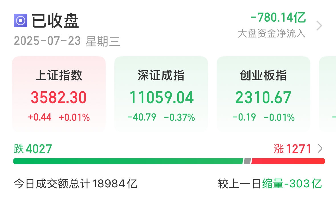 7月23日,A股三大指数冲高回落,沪指再创今年新高,冲过3600点又得而复失。截至收盘,沪指微涨0.01%,收报3582.30点;深成指跌0.37%,收报11059.04点;创业板指跌0.01%,收报2310.67点。全市场成交额18984亿元,较上日缩量303亿元。全市场超4000只个股下跌。