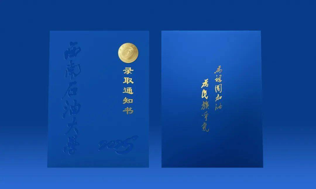 今年,西南石油大学的录取通知书整体是蓝底烫金色调,定制专属EMS封套。录取通知书右上角校徽化身为精美的纪念币,金黄腰封勾勒出学校正门、成都校区图书馆和南充校区第二实验楼(火箭楼)等标志性建筑轮廓,定格校园专属风景,将学校风貌提前“装”进同学们逐梦的行囊。