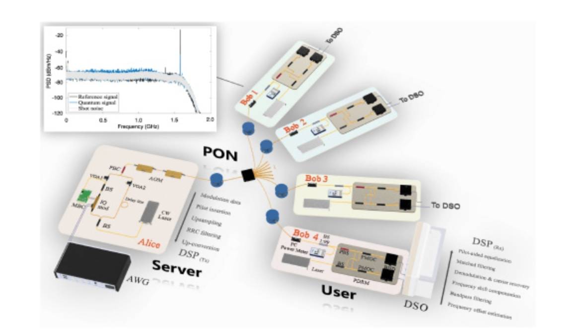 进一步将理论转化为实践,在实验中,研究团队采用下行无源光网络传输架构,中心节点生成量子信号,并通过“广播”方式同时发送给多个终端用户,每位用户使用自己的设备独立接收并处理这些信号。