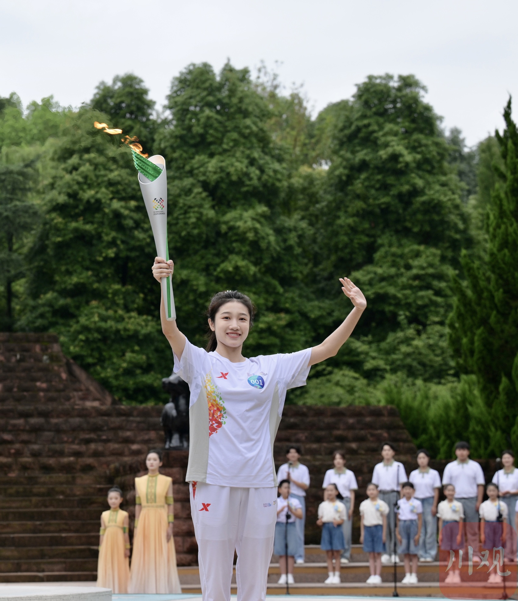 7月26日8时54分,三星堆博物馆祭祀台广场,在全场观众的注目下,随着首棒火炬手——巴黎奥运会艺术体操冠军黄张嘉洋高擎“竹梦”火炬,阔步前行,开启了成都世运会火炬传递活动。