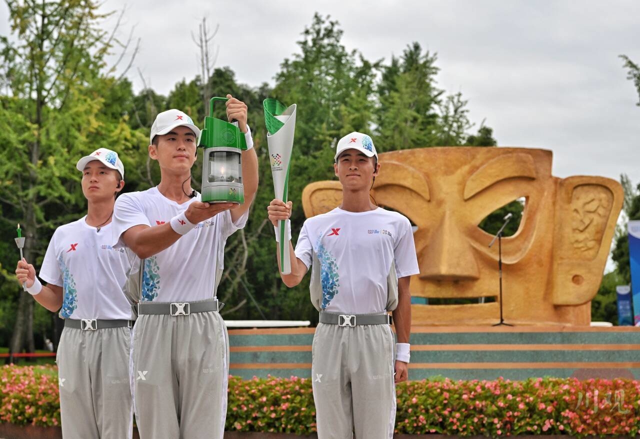 7月26日上午,成都金沙遗址博物馆南门广场,在黄金面具塑像的注视下,第12届世界运动会(简称“成都世运会”)火炬传递活动第二站正式启动。