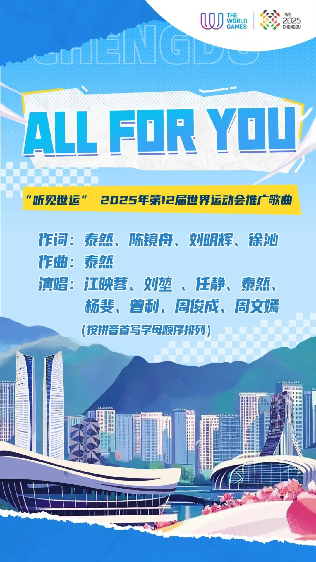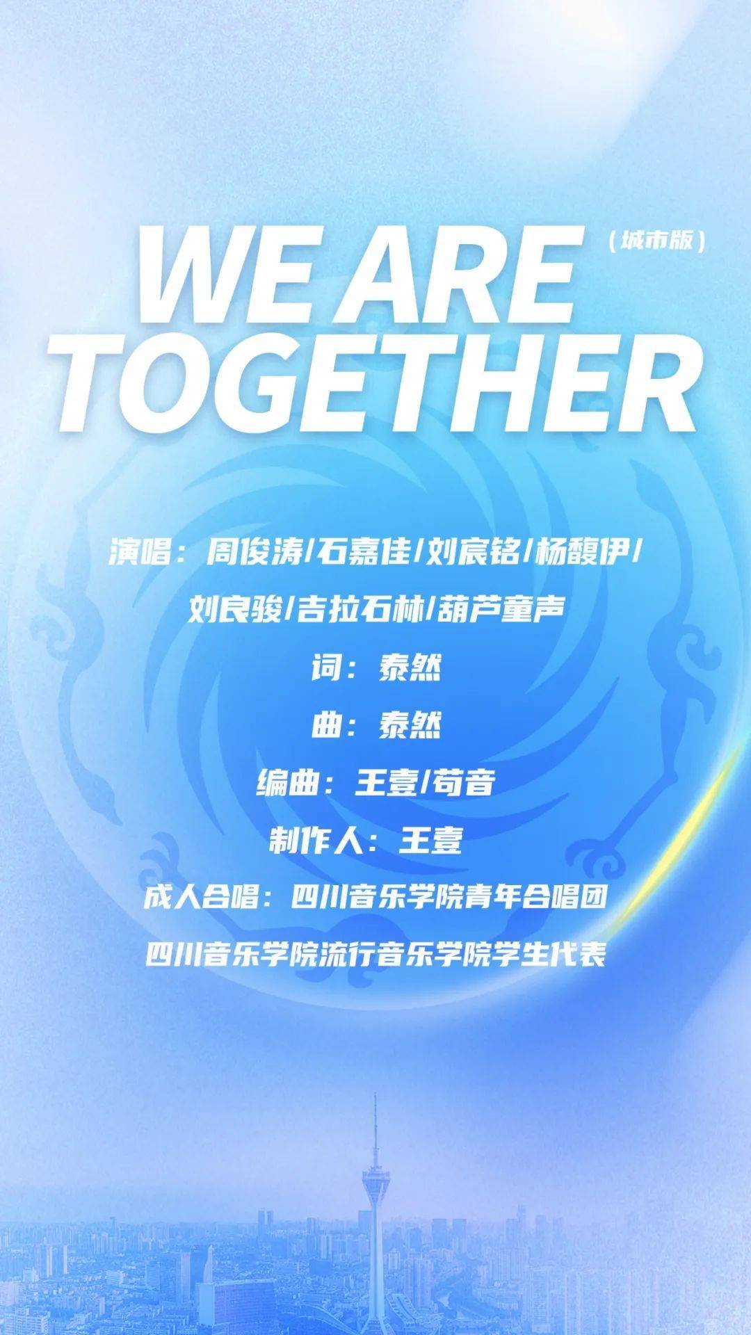除了世运推广曲外,这首活力满满的城市推广曲也不容错过。该曲改编自成都武侯文化创意产业投资有限公司制作发行的We Are Together,以音乐的方式完成歌曲从赛事推广到城市推广的过渡,展现赛事体育精神。该版本由《玉盘》制作团队编曲重制,邀请成都街头艺人、青年音乐人、实力唱将等参与演唱,以极具氛围感与故事感的旋律缓缓展开,男女声交错铺陈,诉说着从四海八方而来相遇成都的温暖故事,情感在音乐中逐渐升温,最终汇成一句动人的“我们在一起”。