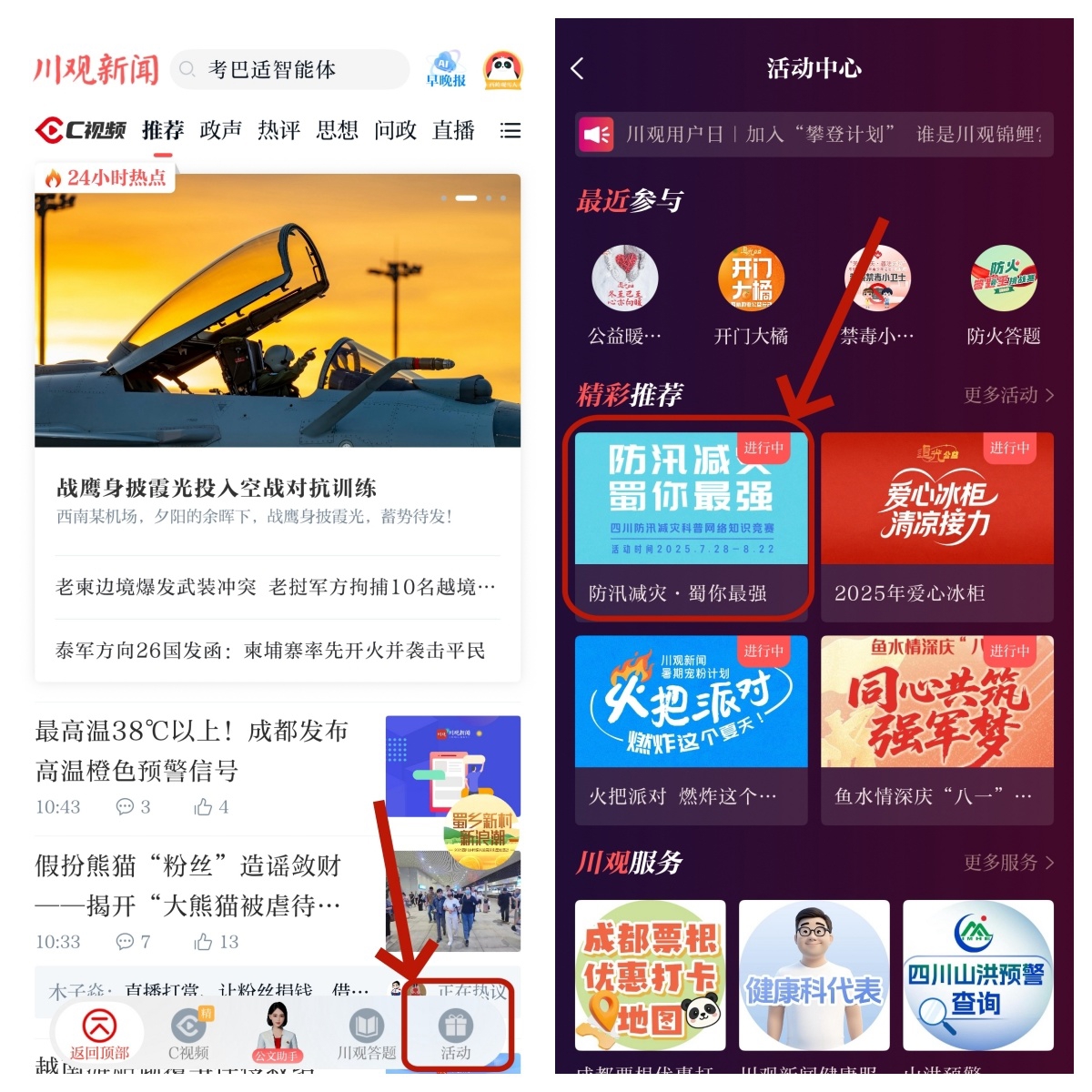 方式三:在川观新闻首页,点击“活动”,找到《防汛减灾·蜀你最强》活动图片,点击即可参与答题;