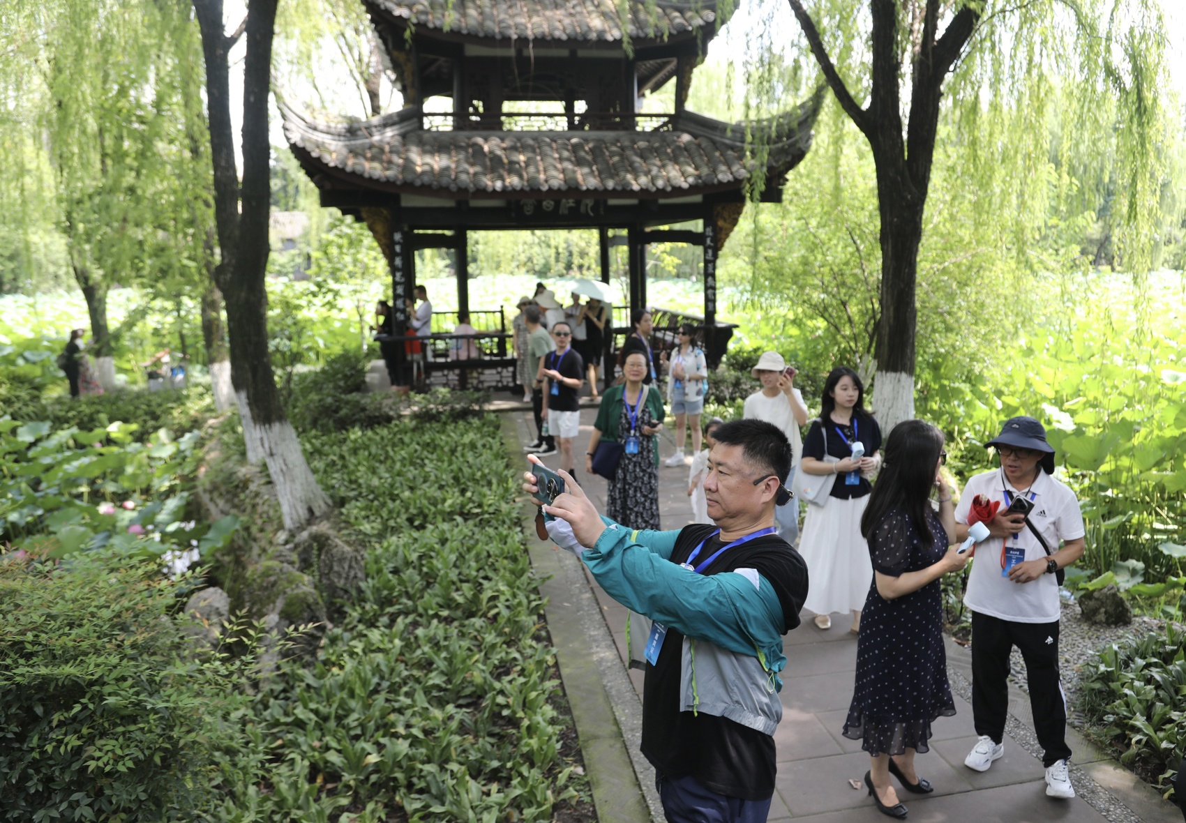 7月27日,由重庆市侨办、重庆市政府新闻办、重庆市侨联、四川省侨办、四川省政府新闻办、四川省侨联等共同组织的“行走中国·2025海外华文媒体川渝行”活动走进成都市新都区。来自法国、捷克、阿联酋、斯里兰卡等国家和地区的20余家主流华文媒体代表探访新都桂湖,破解历史遗存与现代城市的共生密码。