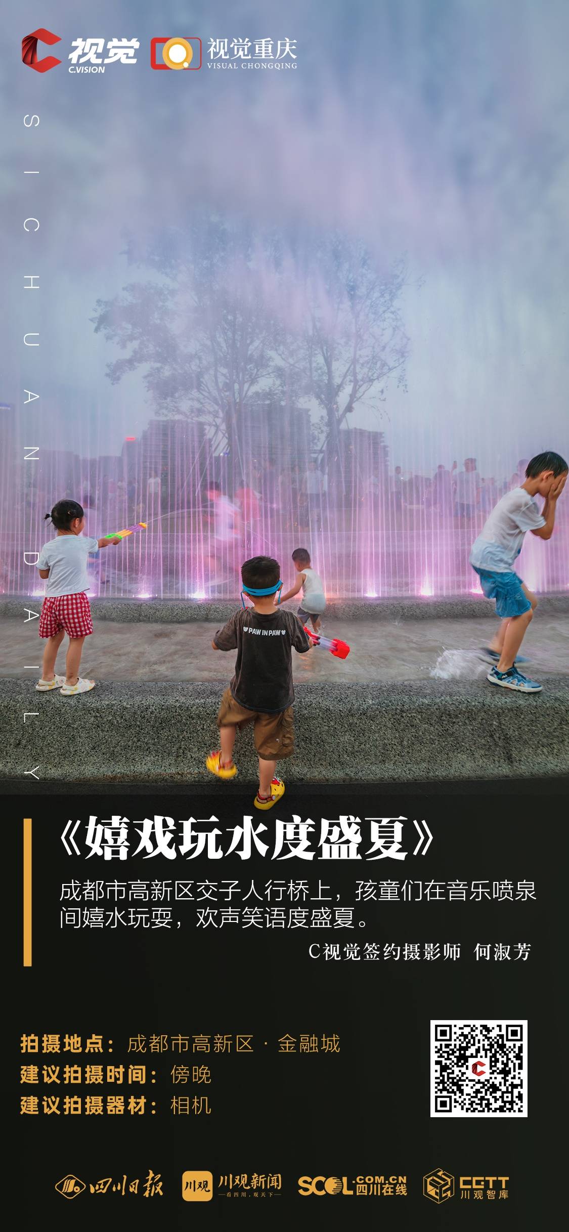 •都江堰南桥下,夜拍慢门把耍水少年的欢笑写成光的轨迹,白天看比赛、傍晚来“冲凉”;