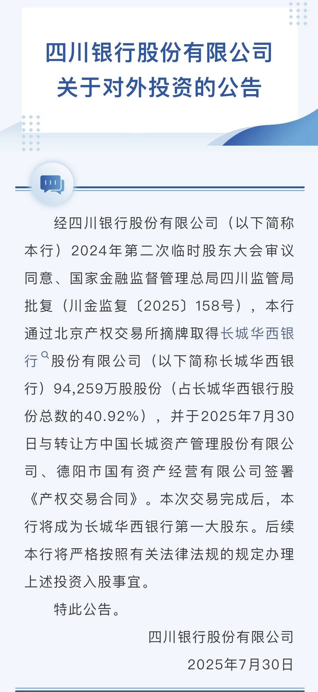 7月30日,四川银行股份有限公司发布公告,经该行2024年第二次临时股东大会审议同意、国家金融监督管理总局四川监管局批复,四川银行通过北京产权交易所摘牌取得长城华西银行股份有限公司94259万股股份,占长城华西银行股份总数的40.92%,并于2025年7月30日与转让方中国长城资产管理股份有限公司、德阳市国有资产经营有限公司签署《产权交易合同》。
