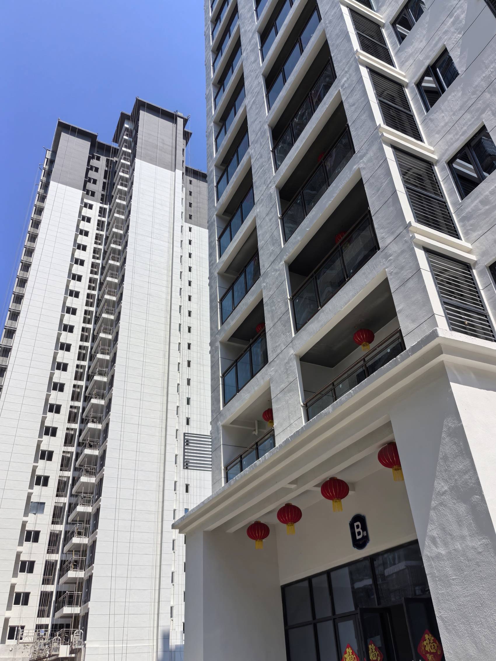 崭新的店子梁二小区,阳台上挂着红灯笼。