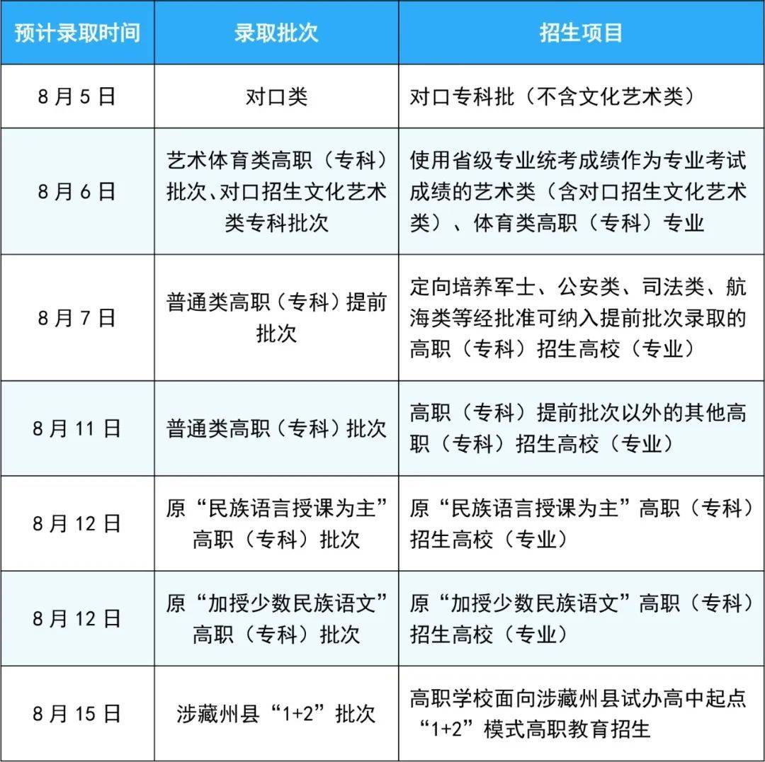进入8月,我省2025年普通高考录取进程已过半。高考录取进入普通类、艺术类、体育类等多个招生类型的高职(专科)批次,各批次预计录取时间详见下表,请考生密切关注。