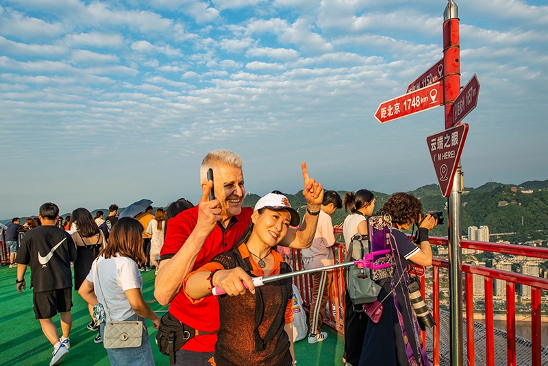 一对跨国情侣在重庆“云端之眼”观景平台上甜蜜自拍。