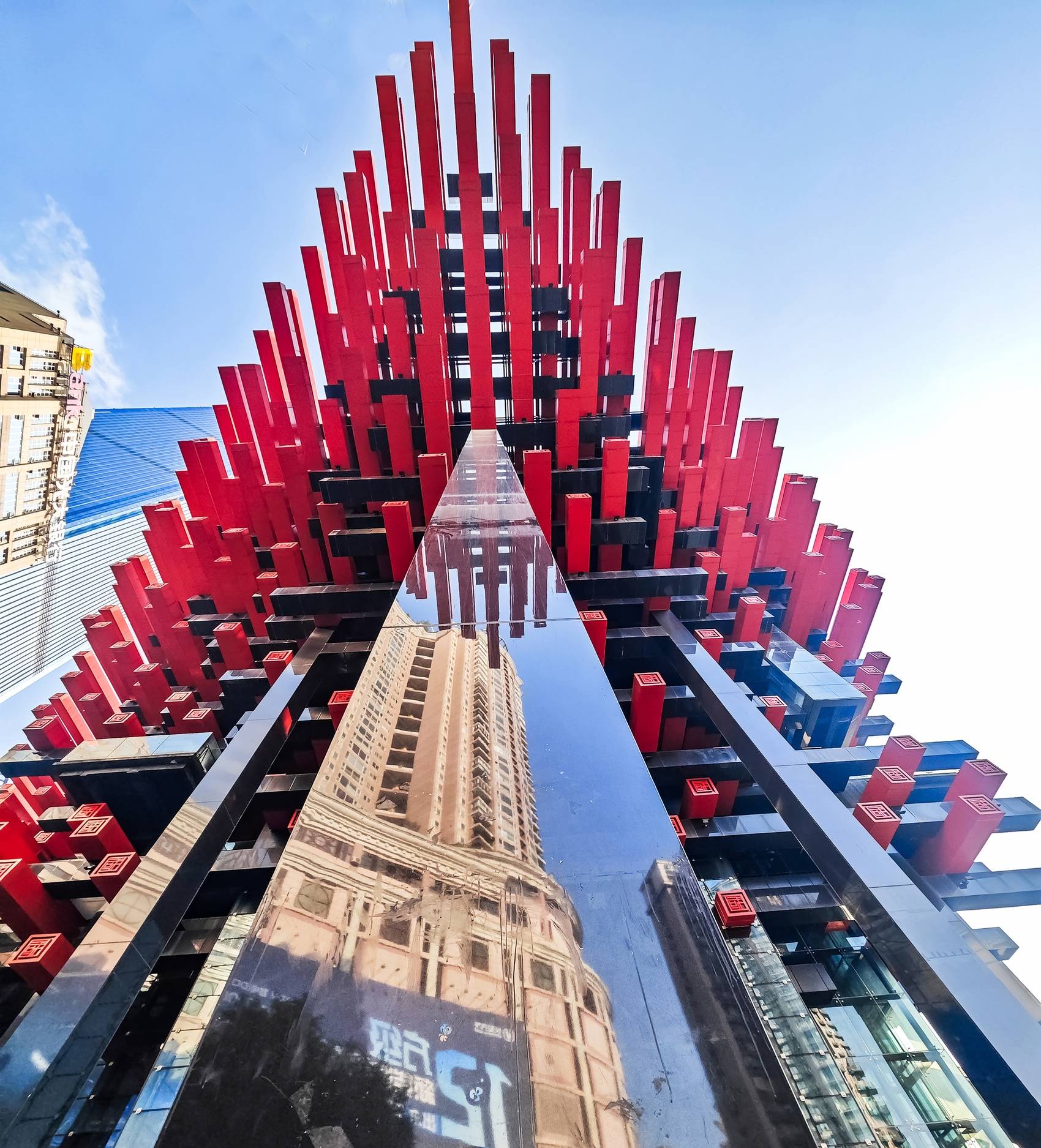 拍摄秘籍:测光,拍摄模式设为手动曝光,建议搭配快门线使用。拍摄时可用广角镜头或手机采取低机位仰拍,注意利用建筑的玻璃幕墙倒映周边景致。