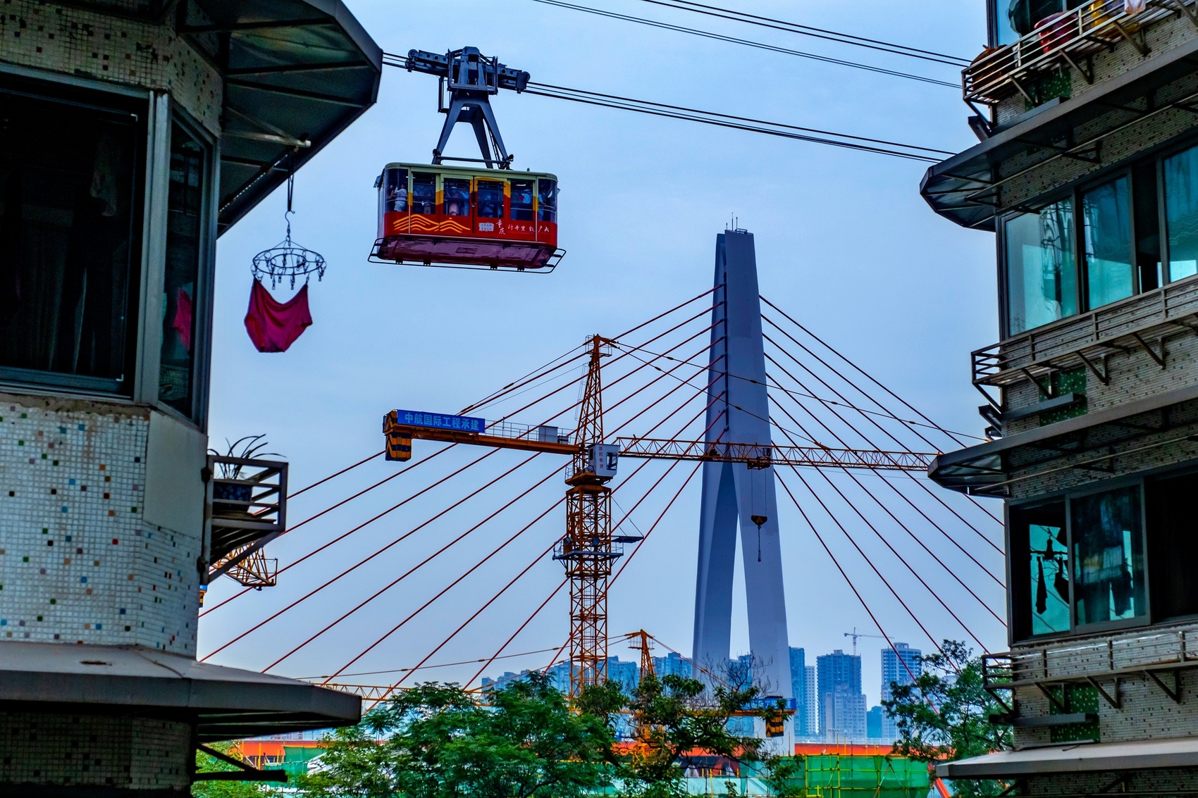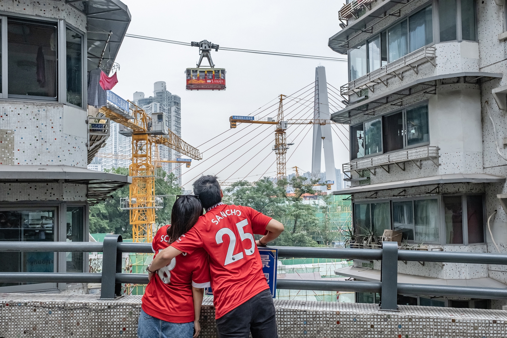 一对情侣观看横跨重庆渝中区小什字的过江索道。