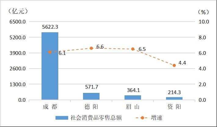 消费品方面,上半年,成都都市圈社会消费品零售总额6772.4亿元,同比增长6.1%,增速高于全省0.5个百分点,占全省比重为47.8%。其中,成都市社会消费品零售总额5622.3亿元,增长6.1%,占都市圈比重为83.0%;德阳市、眉山市、资阳市社会消费品零售总额分别为571.7亿元、364.1亿元、214.3亿元,分别增长6.6%、6.5%、4.4%。