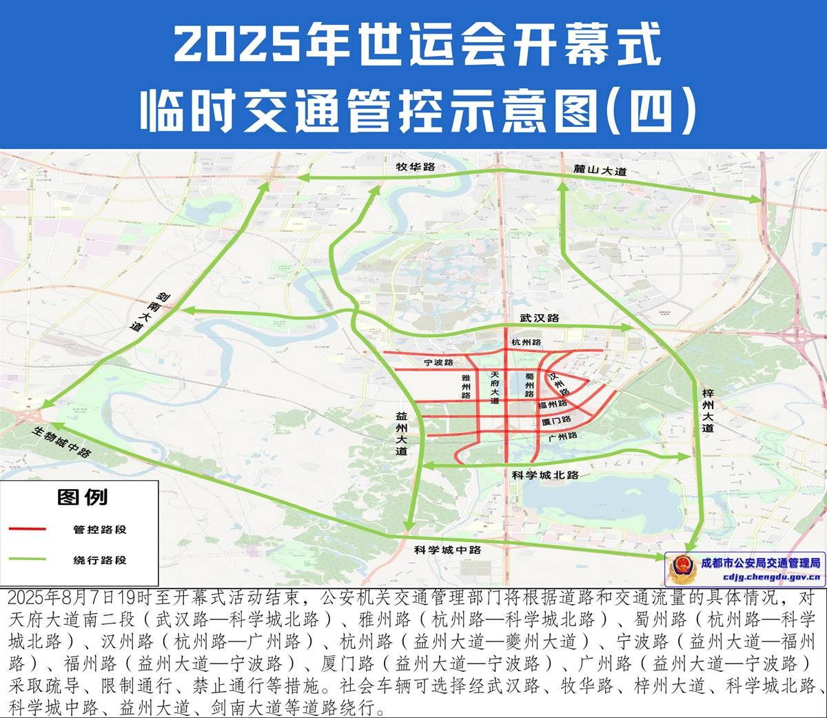 四、2025年8月7日19时至开幕式活动结束,公安机关交通管理部门将根据道路和交通流量的具体情况,对天府大道南二段(武汉路—科学城北路)、雅州路(杭州路—科学城北路)、蜀州路(杭州路—科学城北路)、汉州路(杭州路—广州路)、杭州路(益州大道—夔州大道)、宁波路(益州大道—福州路)、福州路(益州大道—宁波路)、厦门路(益州大道—宁波路)、广州路(益州大道—宁波路)采取疏导、限制通行、禁止通行等措施。社会车辆可选择经武汉路、牧华路、梓州大道、科学城北路、科学城中路、益州大道、剑南大道等道路绕行。