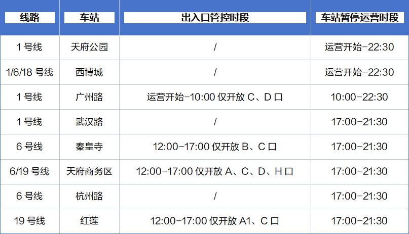 具体管控信息如下表,车站暂停运营服务期间,前往以下车站的乘客可在邻近车站下车或换乘其他交通工具。
