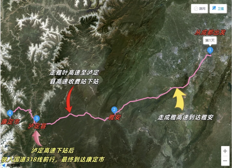 线路1:从成都出发——走成雅高速到达雅安——走雅叶高速至泸定县高速收费站下站——驶入国道318线继续前行——最终到达康定市。