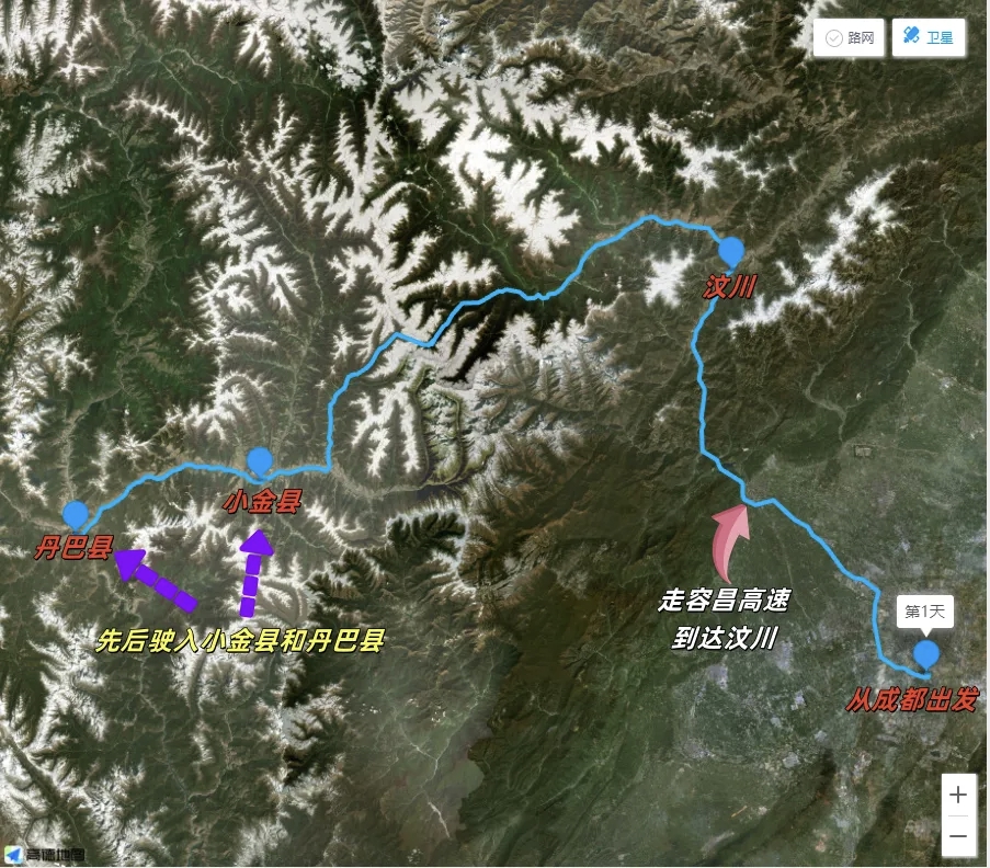 线路2:从成都出发——走容昌高速到达汶川——先后驶入小金县——丹巴县。