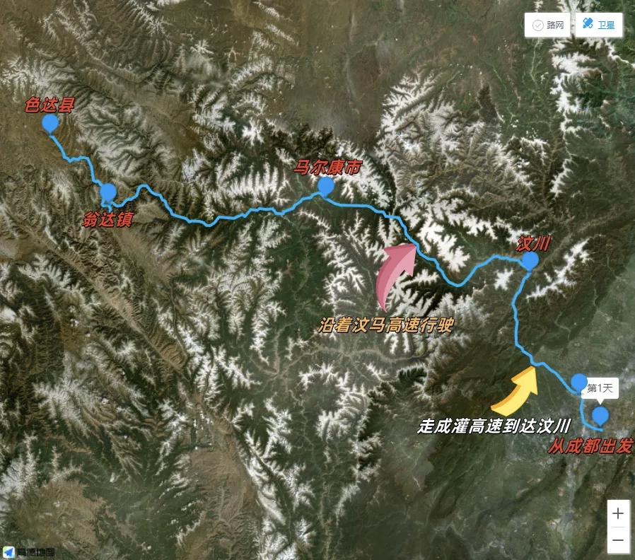 线路3:从成都出发——走成灌高速到达汶川——沿着汶马高速行驶——经马尔康市——驶入翁达镇——后到达色达县。