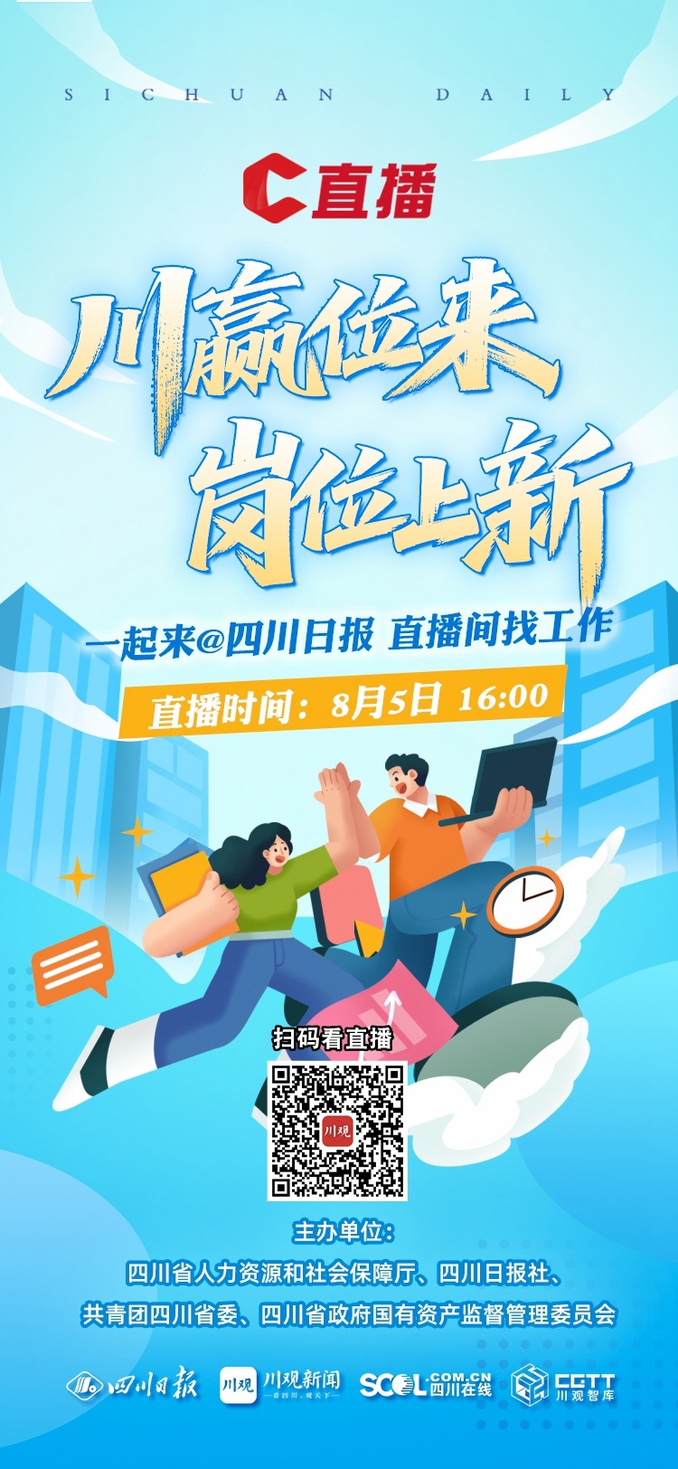 8月5日下午4点,川观新闻直播间(点此进入)将带来其中部分政策性岗位的详细信息,直播将同步在川观新闻客户端、视频号、快手号,四川日报视频号进行,一起来关注直播找工作吧。
