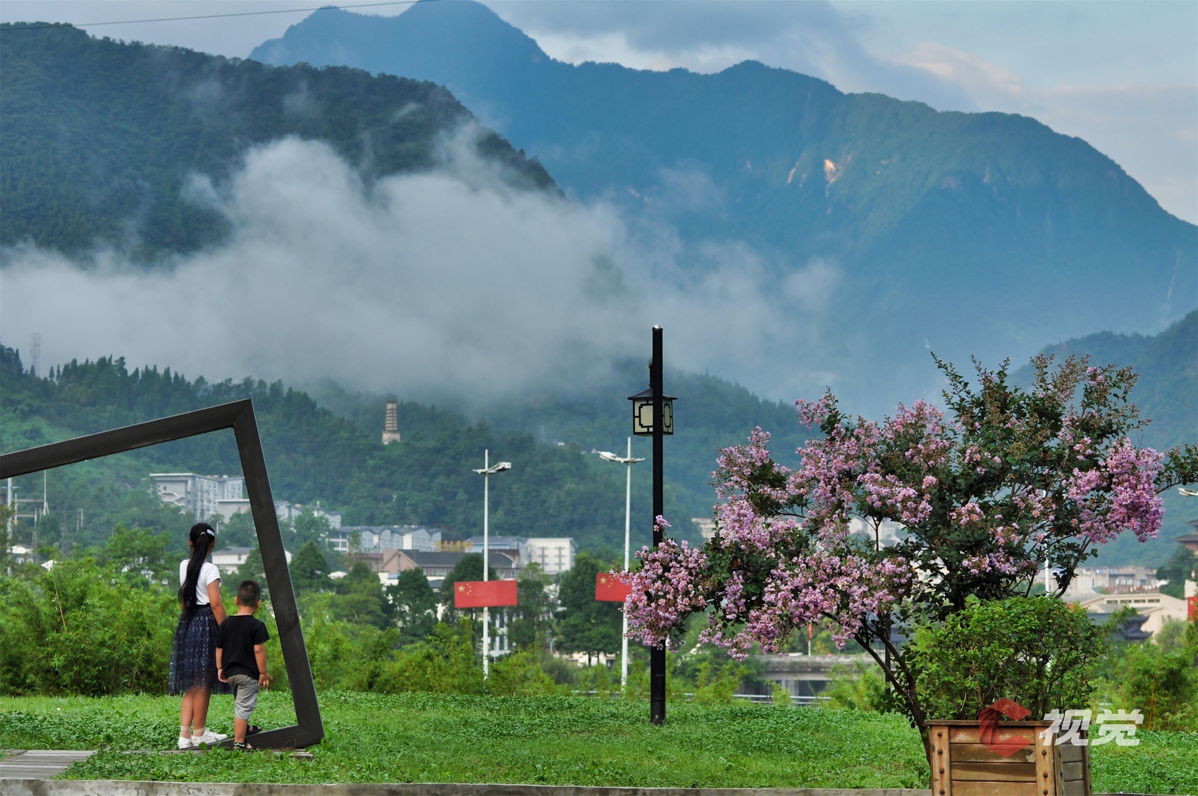 汶川水磨古镇,游客在云雾缭绕的崇山峻岭之间体验清凉。C视觉签约摄影师 罗江涛