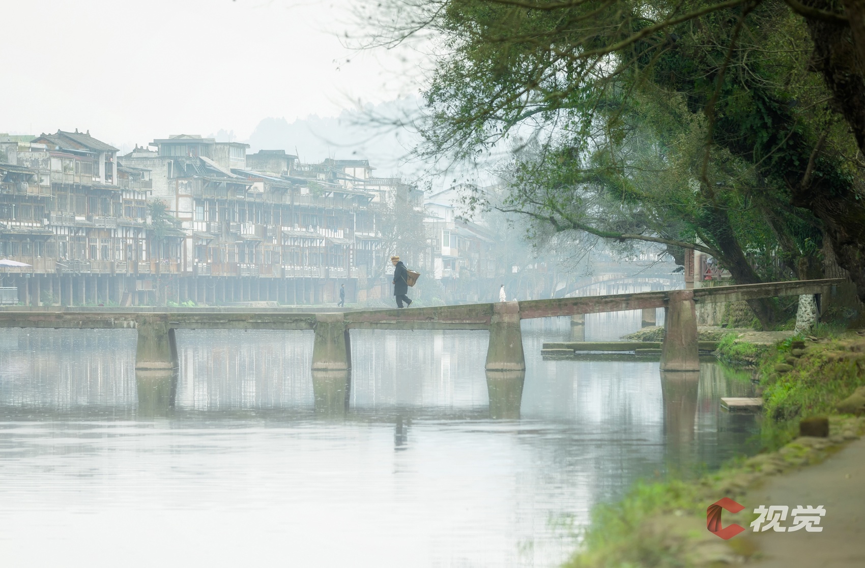 成都邛崃夹关古镇,雾气氤氲,行人背着背篓行走在古石桥上。C视觉签约摄影师 沈军