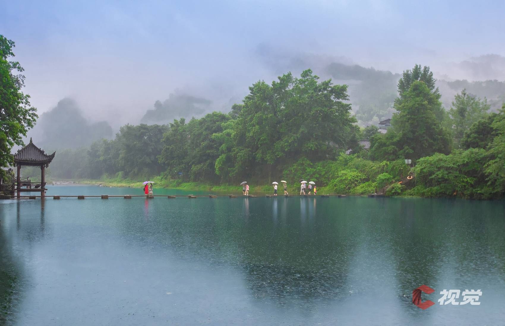 眉山洪雅柳江古镇,行人打伞走入蒙蒙烟雨之中。C视觉签约摄影师 沈军
