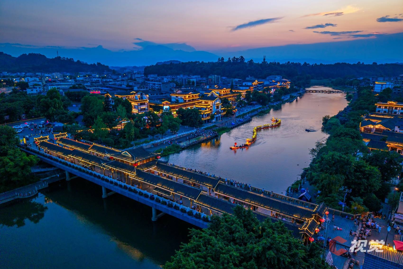 乐山苏稽古镇峨眉河上,龙形游船沿河而下,人们来到这里纳凉散步。C视觉签约摄影师 胡威