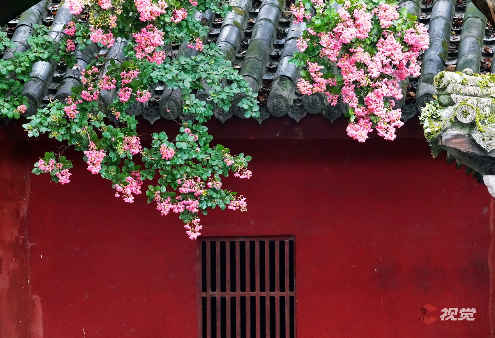 入伏之后,夏日限定的紫薇就开启了繁花模式,浅粉与绛红的紫薇花缀满枝头,在都江堰二王庙和伏龙观的古朴飞檐下、绵阳平武报恩寺的红墙旁、崇州罨画池的碧波边,百年紫薇花如云霞版绽放,宛如诗意雅致的锦缎,妆点着红墙黛瓦的千年古建,成为市民游客消暑赏景的好去处。