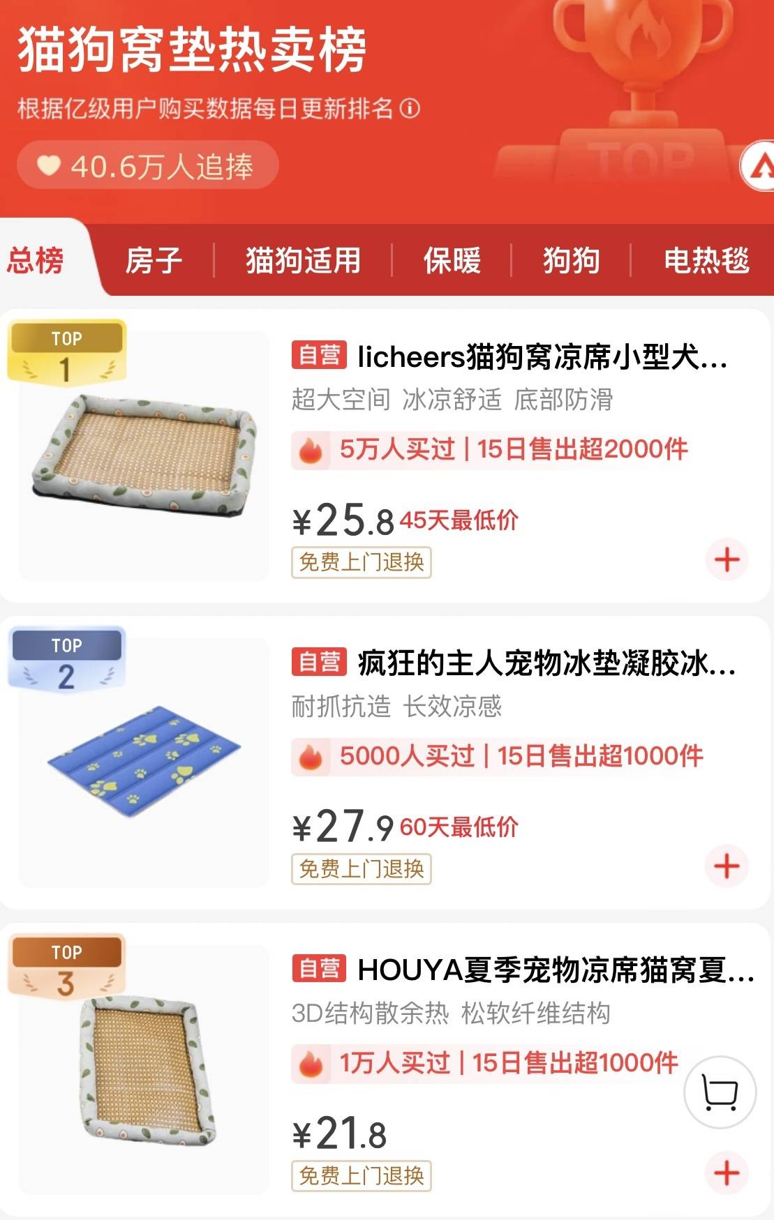 例如,京东排行榜的“猫狗窝热卖榜”显示,8月7日,“凉席猫狗窝”等类别的商品占据榜单前三位,且近半个月内的销售量均已破千。同日,天猫榜单的“猫垫热销榜”显示,排名第一的产品为一款售价不到7元的宠物冰垫,该产品多天蝉联榜首,24小时内销量已突破200件。