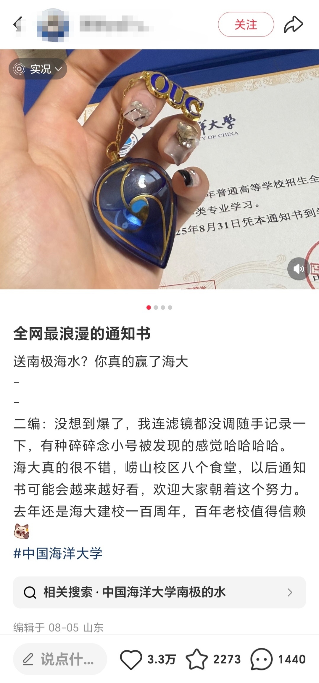 对于这一现象,校方表示,吊坠中的南极海水,是学校科考团去南极取的海水,今年首次用在录取通知书中。二手平台所售商品非官方行为,同时提醒网友,谨防假冒,不建议高价购买。