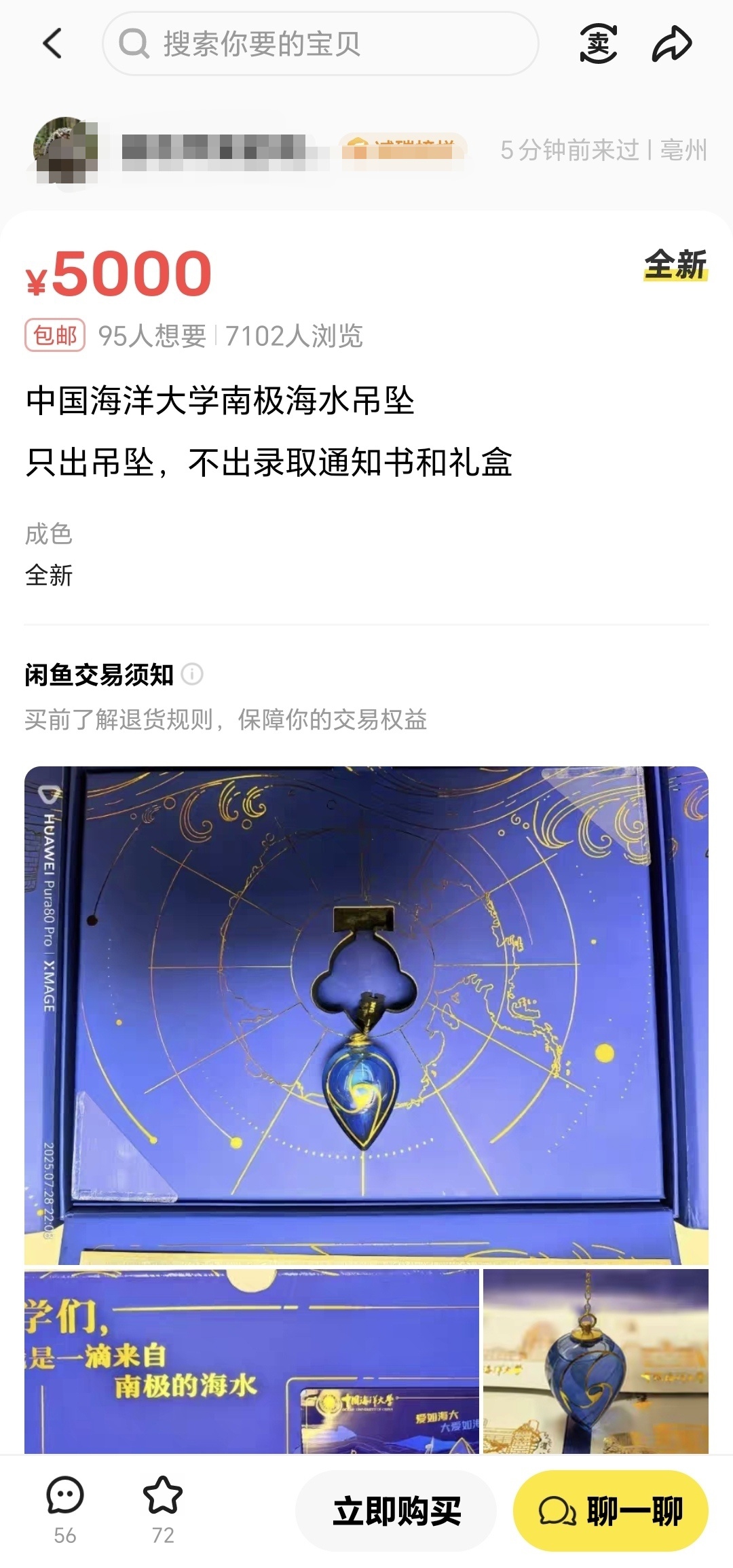 高关注度下,这枚吊坠也在二手平台上炒出高价。记者在某二手平台上发现,多个卖家挂出了中国海洋大学的南极海水吊坠,标价2000元到5000元不等,有的商品页面显示“95人想要”,“7102人浏览”。