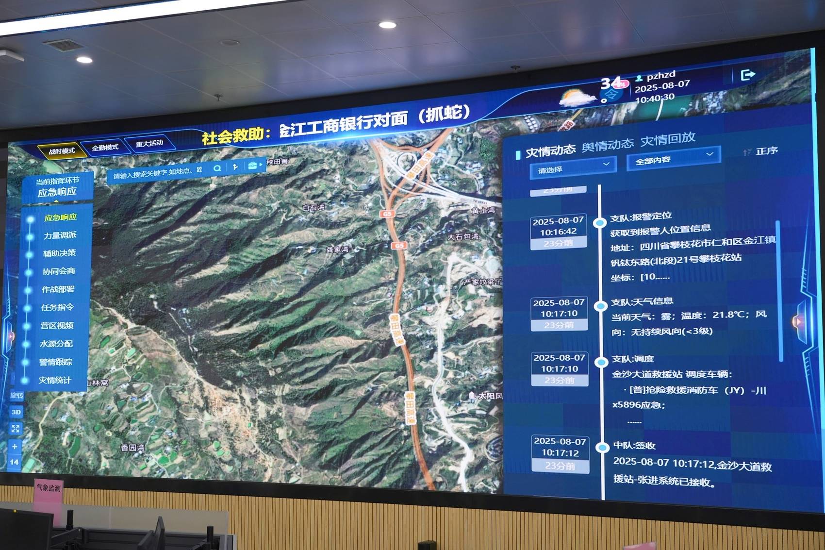 8月7日,记者走进攀枝花智慧城市运营中心的指挥大厅,大屏上,各类实时数据正不停闪烁。10点16分42秒,一条名为“抓蛇”的警情弹现大屏。10点17分10秒,攀枝花市消防救援支队调度金沙大道消防救援站出警。
