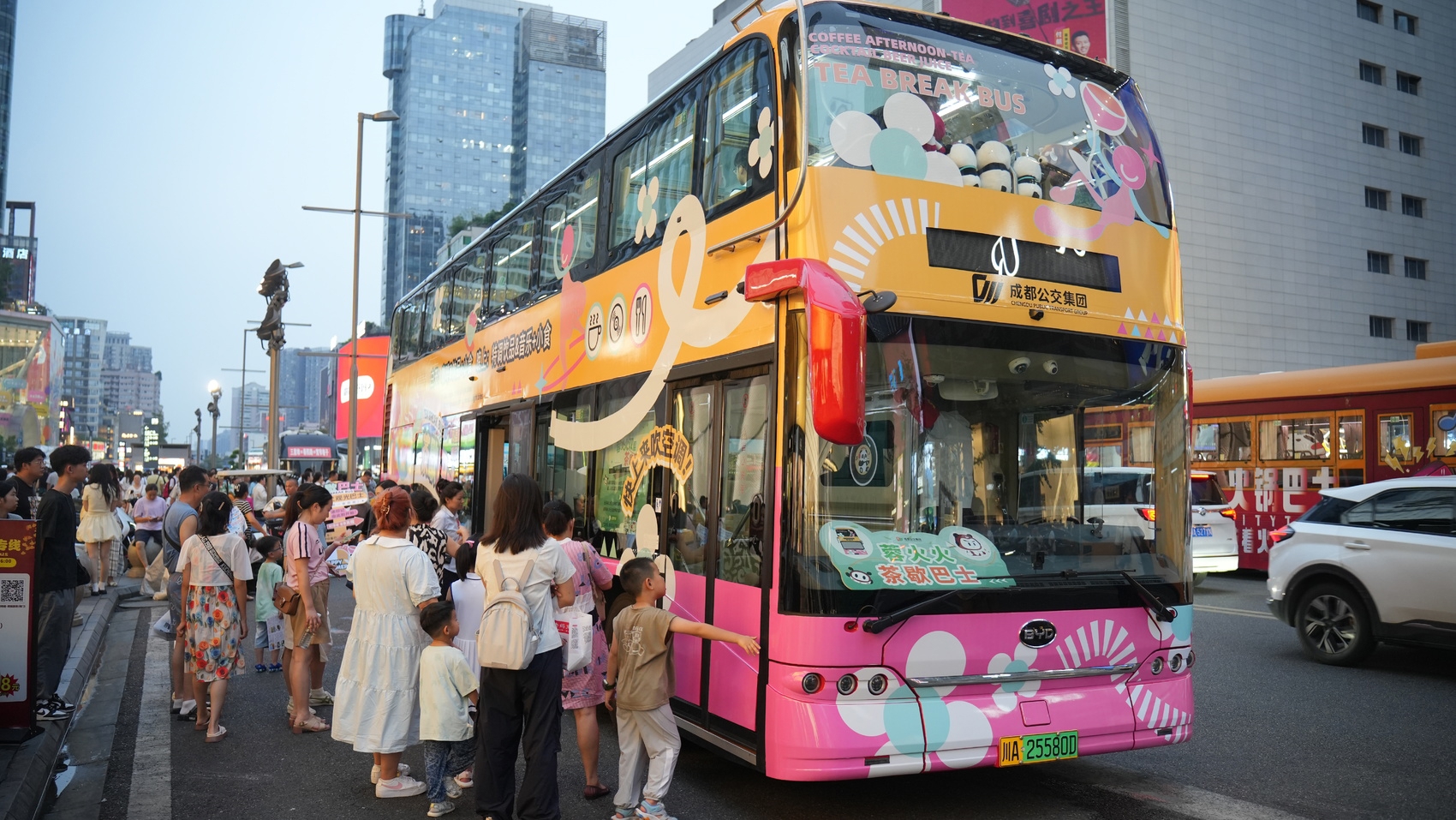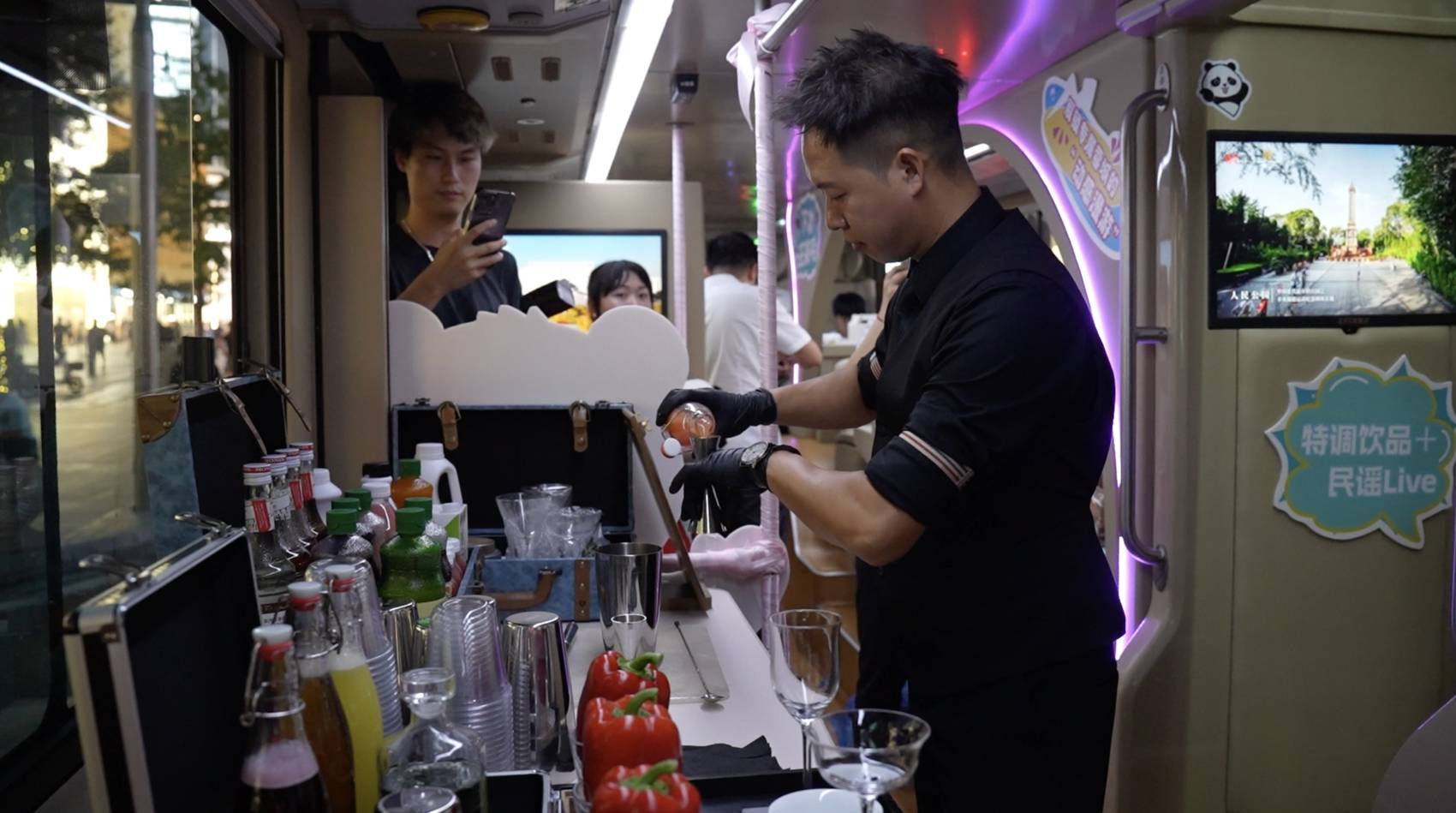 夜幕降临,“茶歇巴士”开始行驶在璀璨夜色中,特邀民谣歌手浅吟低唱,专业饮品师端上特调饮品,春熙路、人民公园、宽窄巷子等城市坐标在窗外依次闪过。“换个角度看成都,这种游玩方式太新颖了。”来自苏州的乘客徐雯说。
