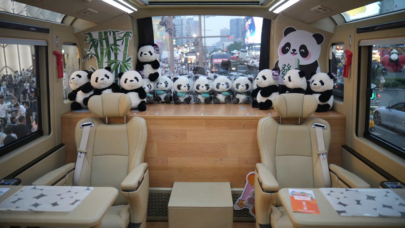 车厢一层后端,是几个配有小桌板的航空座椅。乔佳璐介绍,车辆在一层、二层一共设置24个豪华版商务航空座椅,“这些座椅为纯电驱动,配有空调、按摩等功能,乘客可用扶手右侧的操作面板进行操作。”而在车厢二层,不仅有熊猫、竹子等四川味十足的元素,更有可为乘客带来宽阔视野的穹顶天窗。