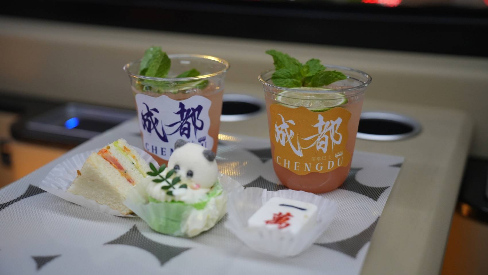 从车辆前门走进车厢,记者首先在左手边看到一个摆满饮品的吧台,饮品师正忙着为乘客调制饮品,一旁菜单上有麻辣英雄、“花花”的食谱、功夫&茶三种特调饮品。“三种饮品分别以花椒风味糖浆、竹叶青茶汤、四川红茶汤为基底进行调制,购票乘客可以根据喜好进行选择。”成都天府新区公共交通有限公司客运管理部主管乔佳璐介绍。