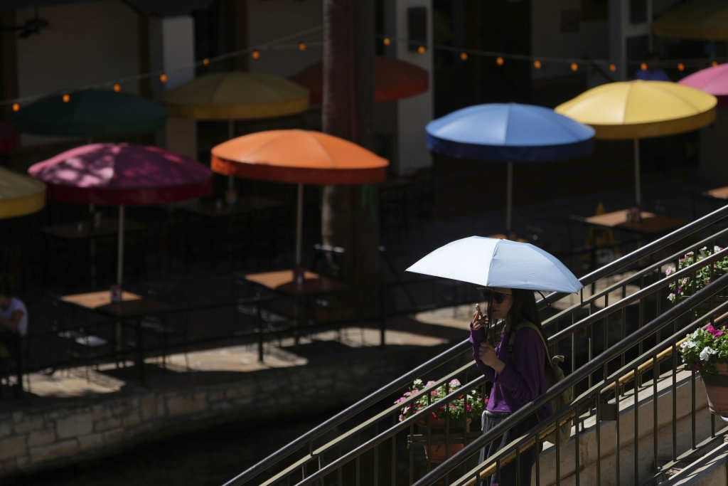 7月29日,在美国得克萨斯州圣安东尼奥,一名游客用雨伞遮挡阳光。图据新华社/美联