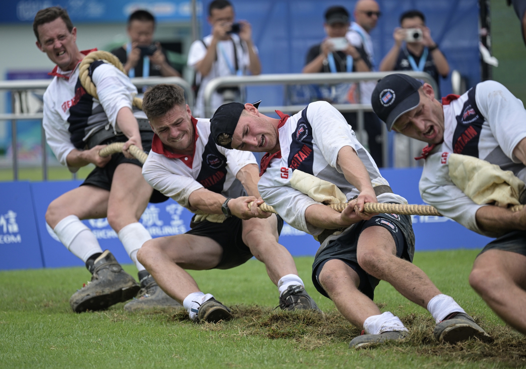 8月9日下午,东安湖体育公园中央广场,成都市世运会男子室外拔河640公斤级比赛中,英国队经过多轮角逐获得冠军。